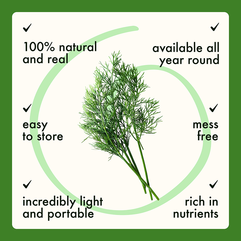 We pick only the finest, wholesome dill and freeze-dry it, in order to preserve its original flavour and nutritional content.