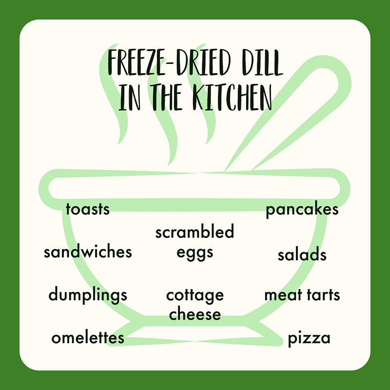 Spice up your cooking game with the fresh taste of dill all year long! This freeze-dried dill is specially selected, prepared and packaged in order to increase its shelf life, without sacrificing its flavour or aroma. The appearance, vivid colour and nutritional values are completely unchanged, making this lyophilized herb amazing addition to both culinary experiments and everyday cooking!