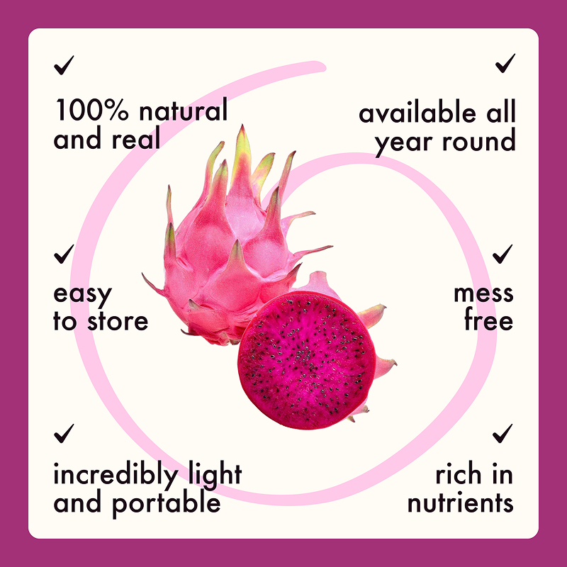 Exotic, bold and beautiful – freeze-dried dragon fruit (pitaya) is more than just eye-catching. This small 30g pack delivers a crunchy snack rich in antioxidants, vitamins and essential fatty acids – anytime, anywhere.