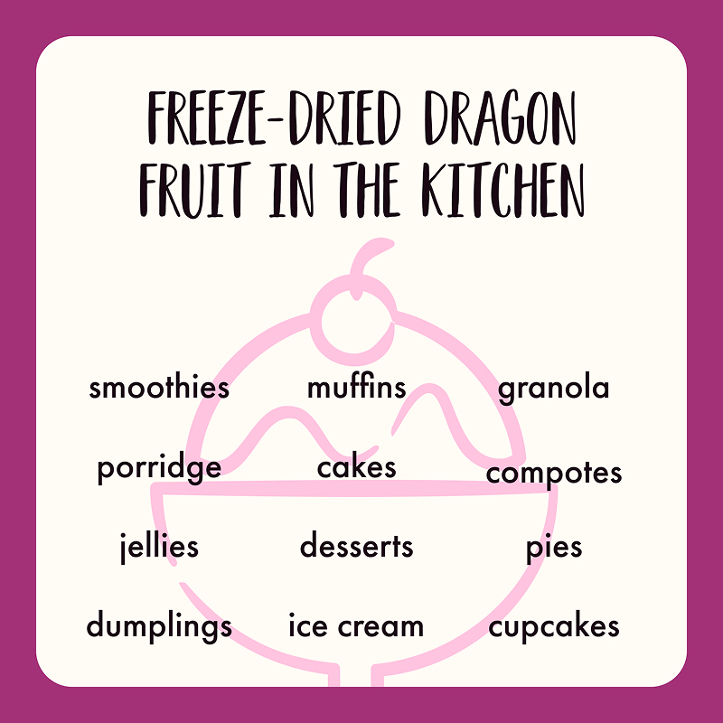 Use dragon fruit slices to decorate smoothie bowls, add crunch to desserts, or create exotic trail mixes. Its unique colour and flavour brighten up any dish – naturally.