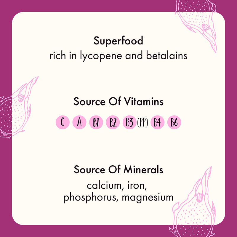 Dragon fruit supports healthy skin, hair and nails thanks to its vitamin C, fibre and mineral content. It also helps strengthen immunity and promotes faster tissue regeneration and wound healing.