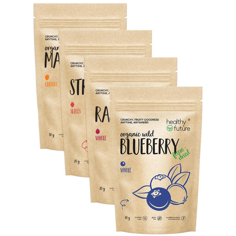 At Healthy Future, we believe healthy eating should be convenient and enjoyable. Our Small Pack Set of freeze-dried fruits brings you the perfect portion of flavourful goodness wherever you are. With 20g packs of freeze-dried strawberries and freeze-dried raspberries, plus 30g packs of freeze-dried organic wild blueberries and freeze-dried organic mango, this set delivers variety, nutrition, and ultimate freshness in every bite.