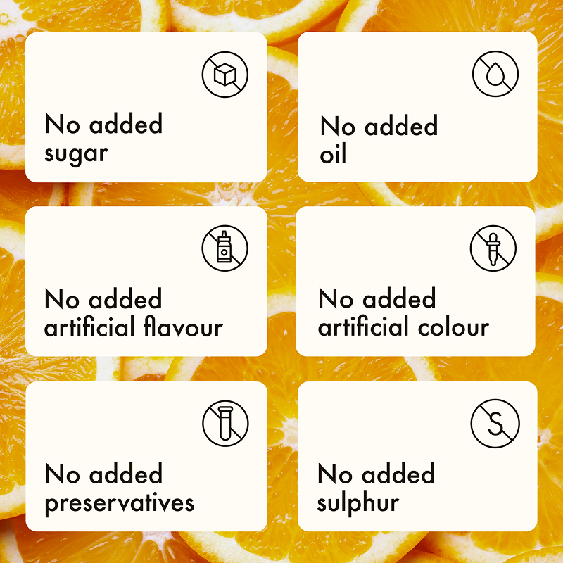 100% natural and real food! The product is free from added sugar, sulphur, preservatives, artificial colours or flavourings, gluten-free, raw, vegan, GMO-free and is not irradiated.