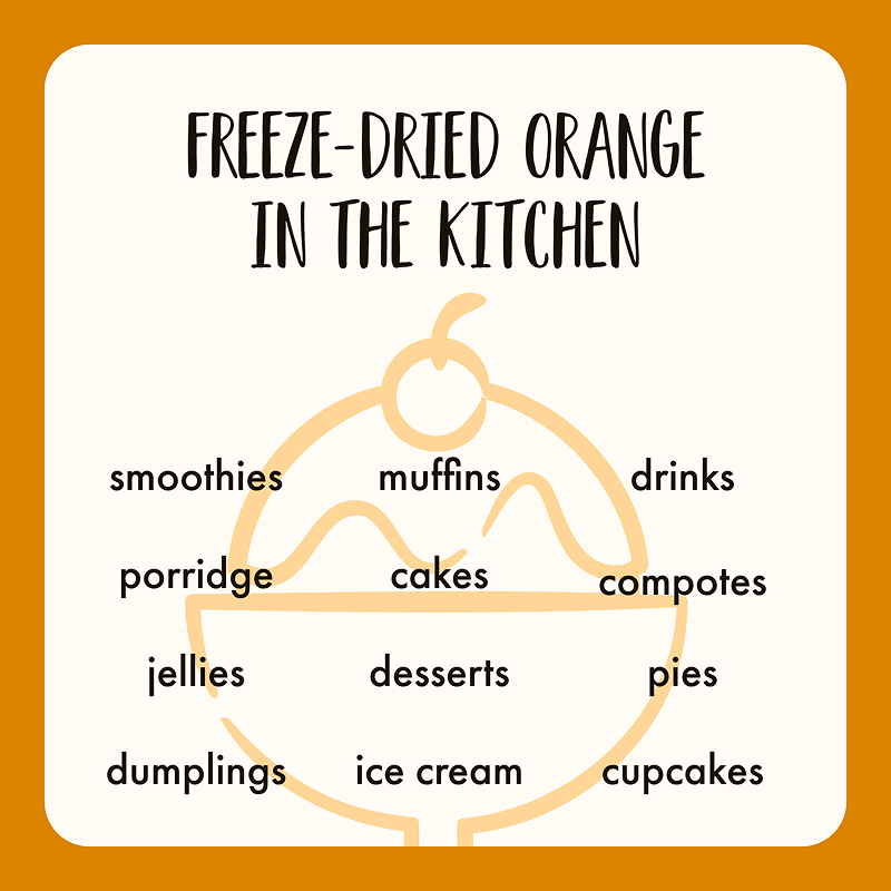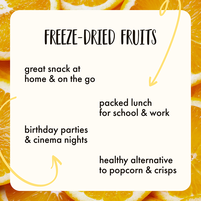 We pick only the finest, wholesome oranges and freeze-dry them, in order to preserve their original flavour and nutritional content.
