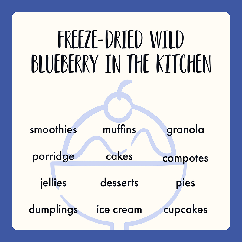 In the kitchen, freeze-dried organic wild blueberries are incredibly versatile. They can be used in a variety of recipes such as cakes, pies, muffins, sweet rolls, cupcakes, chocolate creations, ice cream, desserts, jellies, pancakes, dumplings, soups, compotes, smoothies, and chutney.