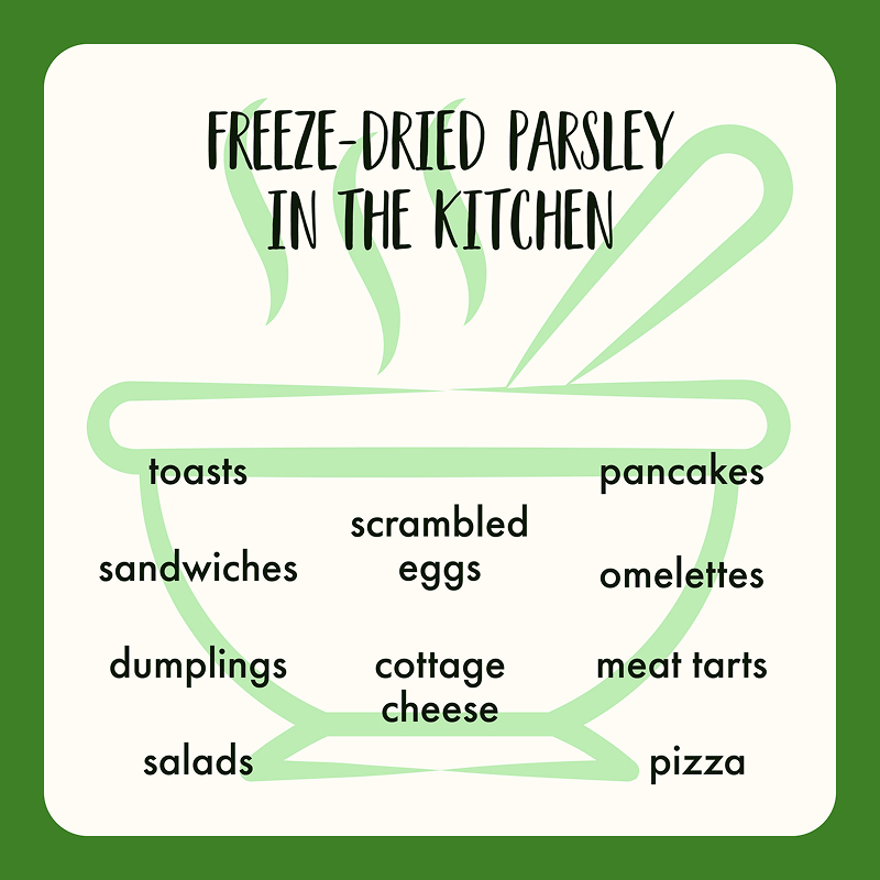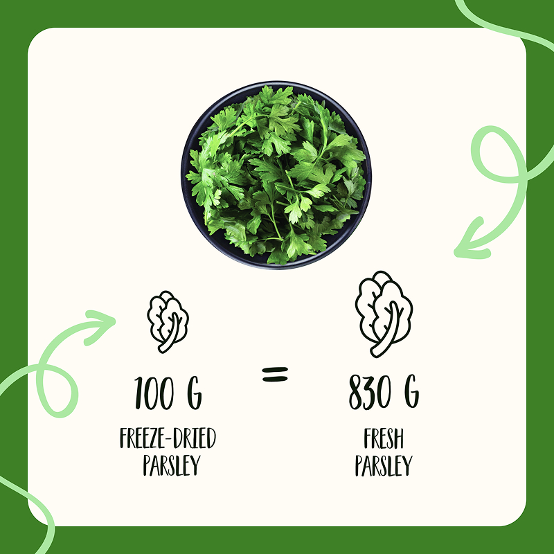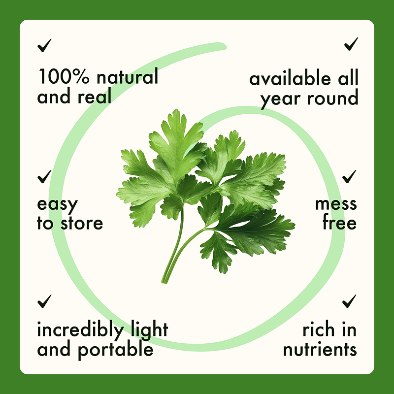 We pick only the finest, wholesome parsley and freeze-dry it, in order to preserve its original flavour and nutritional content.