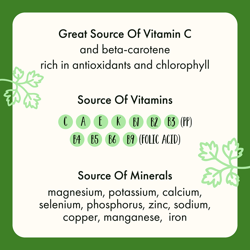 Parsley contains over three times more vitamin C than citrus. In addition, parsley is a very good source of folates and beta-carotene. Thanks to the content of strong antioxidants, this herb slows down the aging processes and reduces inflammation in the body. Moreover, due to antioxidant properties, regular consumption of parsley can prevent cardiovascular diseases (including atherosclerosis, stroke, heart attack), cancer, as well as decreased cholesterol levels and seal blood vessels.