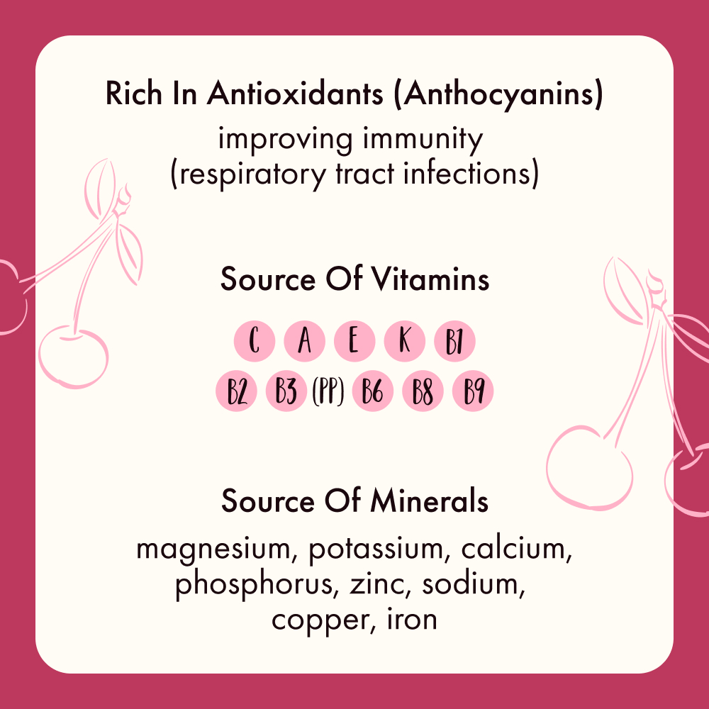Incorporating sour cherries into one’s diet purifies the blood, promotes blood synthesis (countering anaemia), invigorates the immune system and skeletal structure, optimises metabolism, and enhances appetite.